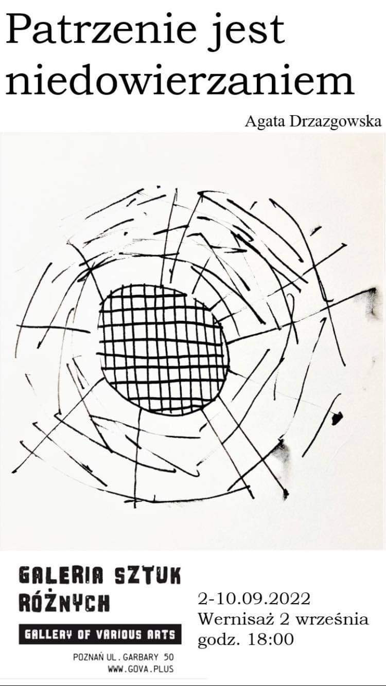 Zapraszamy na wernisaż Agaty Drzazgowskiej – Patrzenie jest niedowierzaniem – 02/09 godz 18:00 Opublikowane przezmbekas21 sierpnia, 20225 września, 2022Opublikowany wUncategorized Udostępnij: Kliknij, aby udostępnić na X (Otwiera się w nowym oknie) X Kliknij, aby udostępnić na Facebooku (Otwiera się w nowym oknie) Facebook Lubię Wczytywanie…