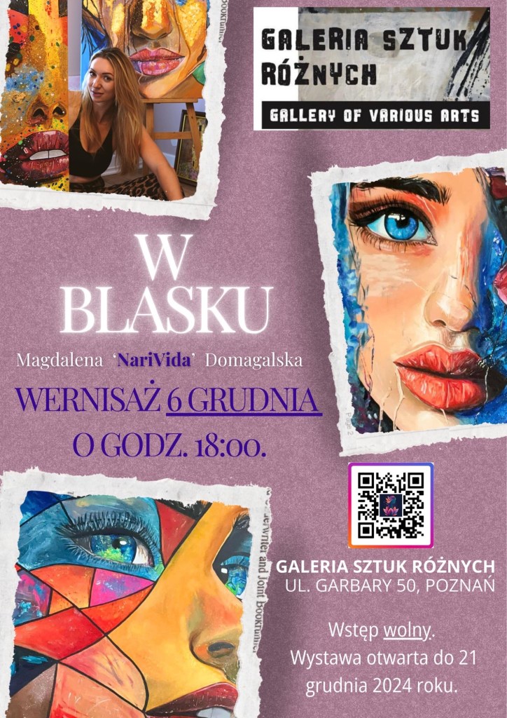 Galeria Sztuk Różnych serdecznie zaprasza na wyjątkowy wieczór sztuki, podczas którego odkryją Państwo fascynujący świat kobiecości widziany oczami Magdaleny ‚NariVida’ Domagalskiej. Wydarzenie odbędzie się 6 grudnia 2024 roku o godzinie 18:00 w naszej przestrzeni przy ul. Garbary 50 w Poznaniu.